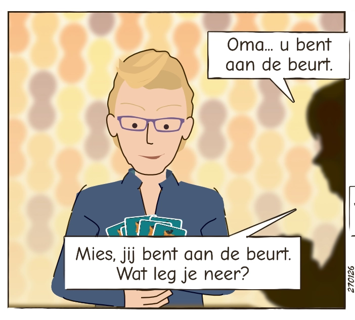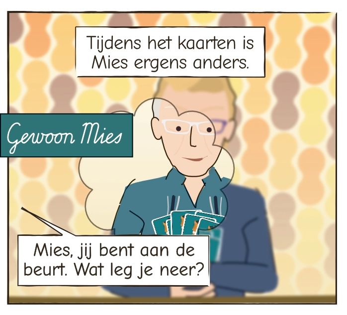 Tijdens het kaarten lijkt alles vertrouwd. De regels zijn bekend, de woorden kloppen. Maar soms speelt Mies tegelijk in twee werelden. Ze is hier — en ergens anders. En juist daar, in dat gewone moment, blijft het contact bestaan.