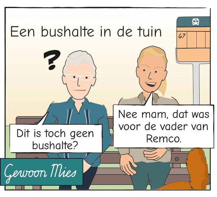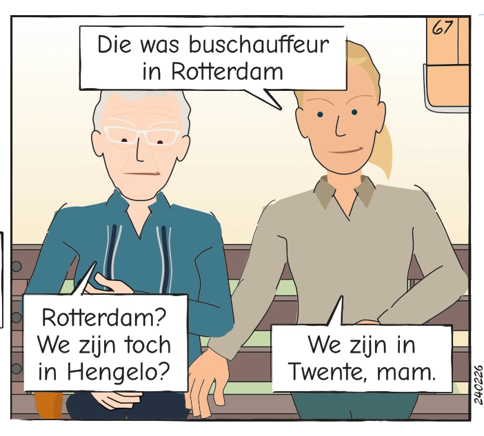 In de tuin van Herbergier Almelo staat een bushalte. Geen grap, maar een herinnering. Voor Mies is het soms Rotterdam, soms Twente — en soms allebei tegelijk.