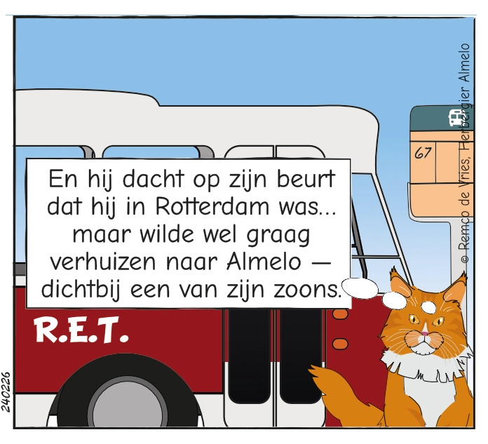 In de tuin van Herbergier Almelo staat een bushalte. Geen grap, maar een herinnering. Voor Mies is het soms Rotterdam, soms Twente — en soms allebei tegelijk.