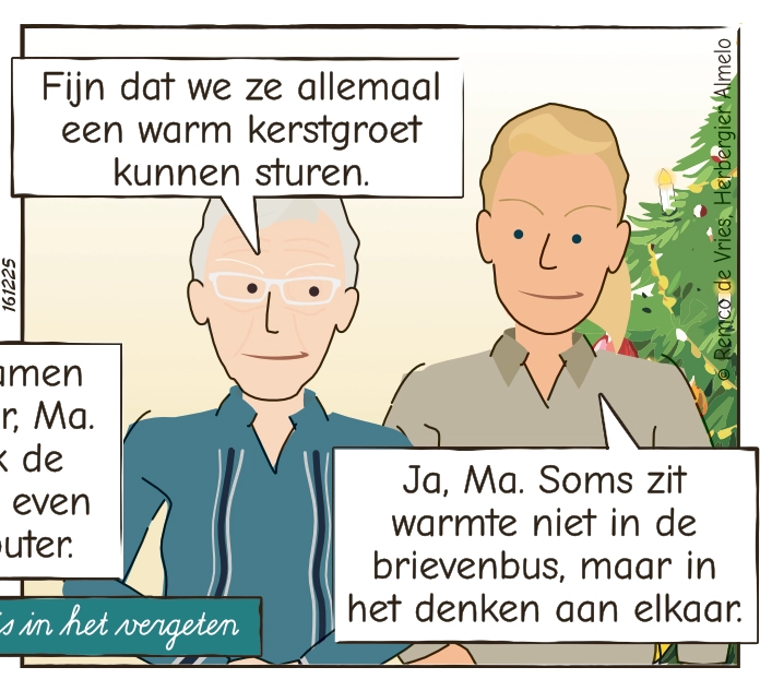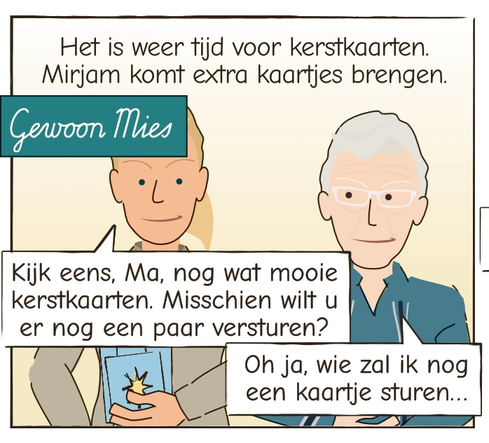 Mirjam heeft nog wat kerstkaarten over en helpt Mies met het schrijven ervan. Terwijl Mies hardop namen noemt van mensen die in háár wereld nog springlevend zijn, helpt Mirjam liefdevol mee. Zo wordt elke kaart een klein lichtpuntje — voor toen én voor nu.