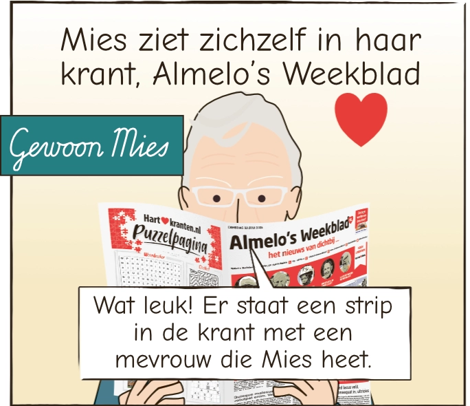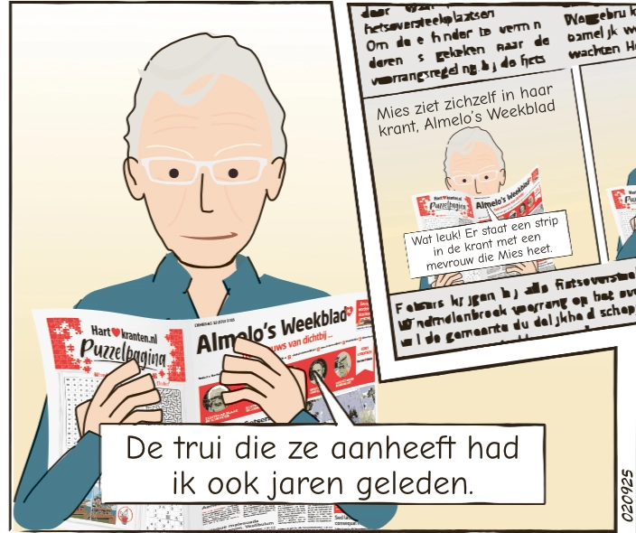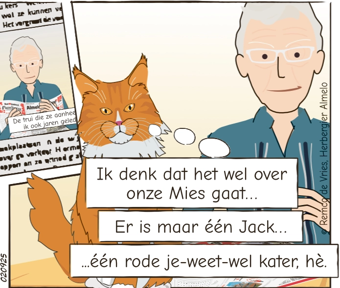 Mies bladert door de krant en spot een tekening van… zichzelf! Ze lacht: “Wat leuk, er is een strip met een vrouw die Mies heet.” Even later merkt ze dat ze soms wel eens iets vergeet – maar “het is niet zo’n ramp”, denkt ze, terwijl ze dezelfde oude trui draagt als de tekenaar. Jack, die rode kater naast zich, grapt: “Dit moet over onze Mies gaan – er bestaat maar één rode kater!